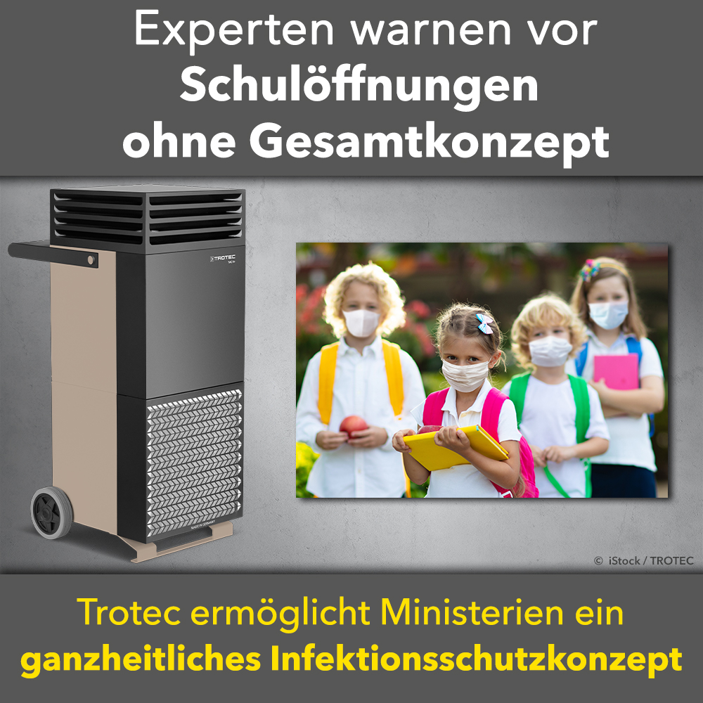 Zum Schutz vor der Einatmung infektiöser Aerosole sollen „Fenster und Türen geöffnet“ werden, um vorhandene Aerosolwolken in der Luft zu verdünnen. Eine weitere Empfehlung lautet, die virenbelastete Raumluft mit einem Ventilator aus dem offenen Fenster zu blasen, im Sommer wie im Winter. Diese, zwar richtigen, aber dennoch oft praxisfernen Empfehlungen führen bei vielen Experten zu ungläubigem Kopfschütteln und teils heftigem Widerstand seitens der Elternverbände und Lehrer. Zu Recht! Eine ganzheitliche Lösung sieht anders aus.