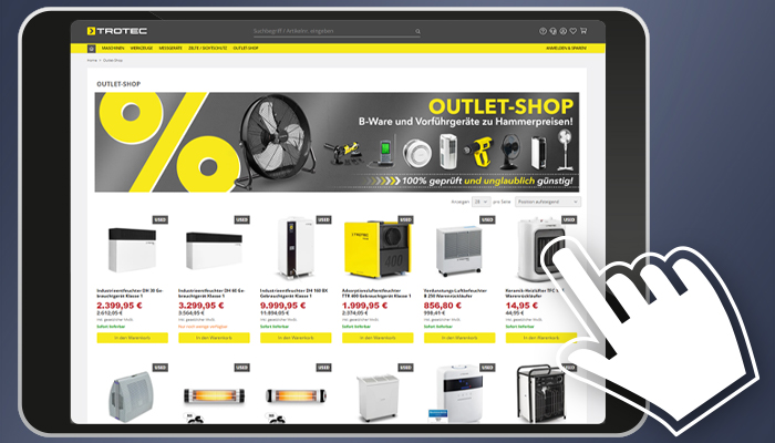 Noch günstiger shoppen Sie im Trotec-Online-Outlet. Hier bieten wir Ihnen stark preisreduzierte Sonderposten, B-Ware, Vorführgeräte und Versandretouren. Heute bestellt, morgen auf dem Weg zu Ihnen nach Hause.