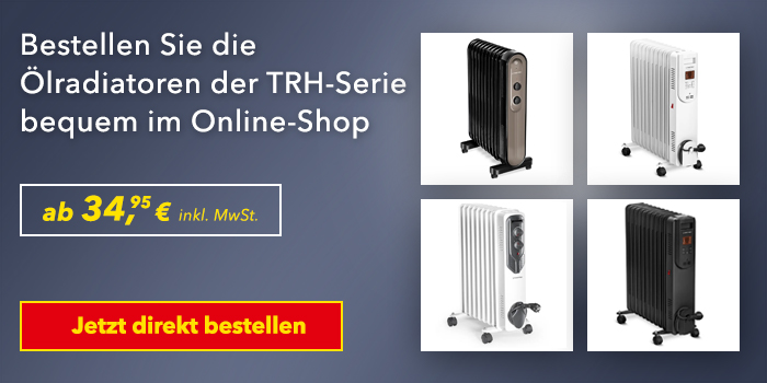 Im Gegensatz zu trägen Fußbodenheizungen, die aufgrund langer Vorheizzeiten bei spontaner Raumnutzung eher hinderlich als förderlich sind, liefern die praktischen Ölradiatoren der TRH-Serie sofort nach dem Einschalten eine wohlig angenehme Sofortwärme. Und das schneller als herkömmliche Radiatoren, bei denen sich die Raumluft erst nach einiger Zeit mit der ansteigenden Erhitzung der Heizrippen erwärmt. Mobile Ölradiatoren wie der TRH 22 E und TRH 23 E verfügen über ein zusätzliches PTC-Heizelement mit Turbogebläse. Die kalte Raumluft wird über einen Lufteinlass eingesogen, im Geräteinneren elektrisch aufgeheizt und über das Turbogebläse wieder in den Raum hinausgeblasen. Dieses Plus an Heißluft beschleunigt die Aufwärmung des Raumes spürbar, bis das Thermoöl im Ölradiator innerhalb weniger Minuten seine volle Heizleistung entfaltet hat.