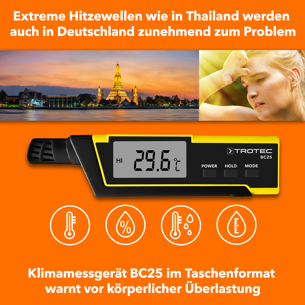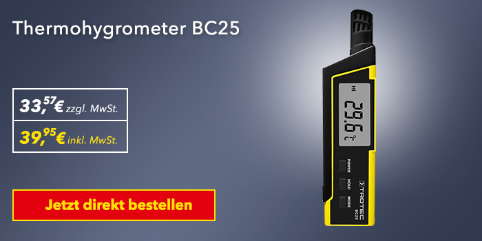 Mit dem praktischen Klimamessgerät BC25 gehen Sie bei allen Wetterlagen auf Nummer sicher und schützen den Körper auf Knopfdruck vor einer übermäßigen Hitzebelastung. Das BC25 ist aktuell zum Aktionspreis von nur 39,95 € (statt 49,95 €) im Trotec-Online-Shop erhältlich.