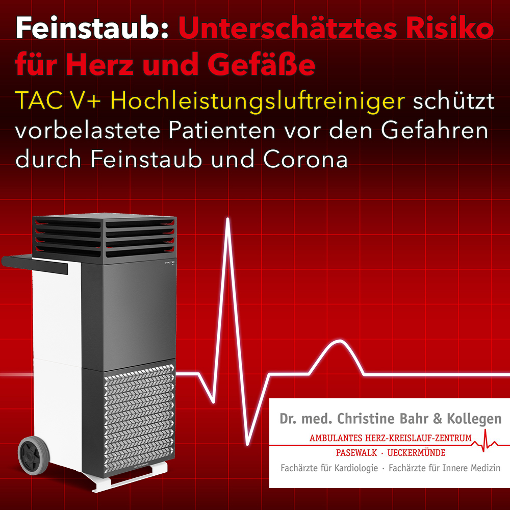 In der kardiologischen Gemeinschaftspraxis Dr. med. Christine Bahr & Kollegen ist man sich der Gefahren und des erhöhten Risikos für Herzpatienten natürlich bewusst. Daher wurden die Wartzimmer mit TAC V+ Hochleistungsluftreinigern von Trotec ausgestattet. Dank der einzigartigen Kombination aus hocheffizienter HEPA-Filter- und Dekontaminationstechnik reduziert der TAC V+ Luftreiniger das luftgetragene Corona-Ansteckungsrisiko im Wartebereich auf ein Minimum. Potentiell infektiöse Aerosole, die als Hauptüberträger des Coronavirus SARS-CoV-2 gelten, aber ebenso für die Gesundheit schädliche Feinstaubpartikel und weitere Schwebstoffe filtert der Hochleistungsluftreiner mit einer Filtereffizienz von 99,995 Prozent aus der Luft.