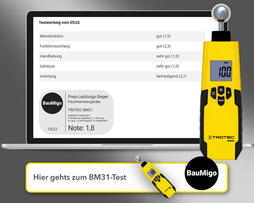 Das unabhängige Online-Magazin BauMigo hat insgesamt neun Materialfeuchtemessgeräte miteinander verglichen und auf ihre Praxistauglichkeit getestet. Erneut konnte sich das Feuchtemessgerät BM31 von Trotec als Preis-Leistungs-Sieger behaupten und den Wettbewerb auf die Plätze verweisen. Damit kommen die Prüf-Ingeniere von BauMigo zum gleichen Ergebnis, wie zuvor das Vergleichsportal ExpertenTesten.de (Bewertung: sehr gut, Vergleichssieger) und die Zeitschrift COMPUTER BILD (Top-Empfehlung der Redaktion). Wer ein Feuchtemessgerät sucht, erhält mit dem BM31 von Trotec ein Feuchtemessgerät der Spitzenklasse – zu einem erfreulich günstigen Preis.