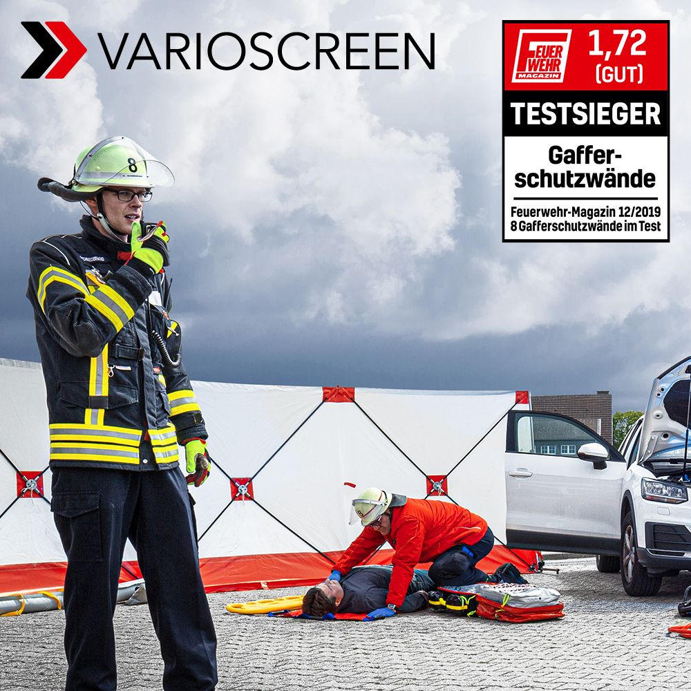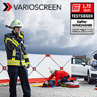 Die zu 100 % blickdichte Sichtschutzwand VarioScreen schirmt Rettungsteams bei Einsätzen vor Störungen durch aufdringliche Gaffer ab, erhält die Privatsphäre von Betroffenen und überzeugt selbst unter schwierigen Einsatzbedingungen. Denn der VarioScreen ist kompakt und leicht im Handling und von nur einem Helfer ganz einfach aufzubauen. Der Sichtschutz besteht aus stabilem Fiberglas-Gestänge mit extrem beanspruchbarem Polyestertuch und ist mit wenigen Handgriffen sekundenschnell standfest aufgestellt. Mit extra-robusten Reißverschluss-Anschlüssen lässt sich der Sichtschutz von 7 auf 14 Meter oder mehr verlängern. Zusammengefaltet ist der VarioScreen in robusten Tragetaschen auf kleinstem Raum lagerbar.