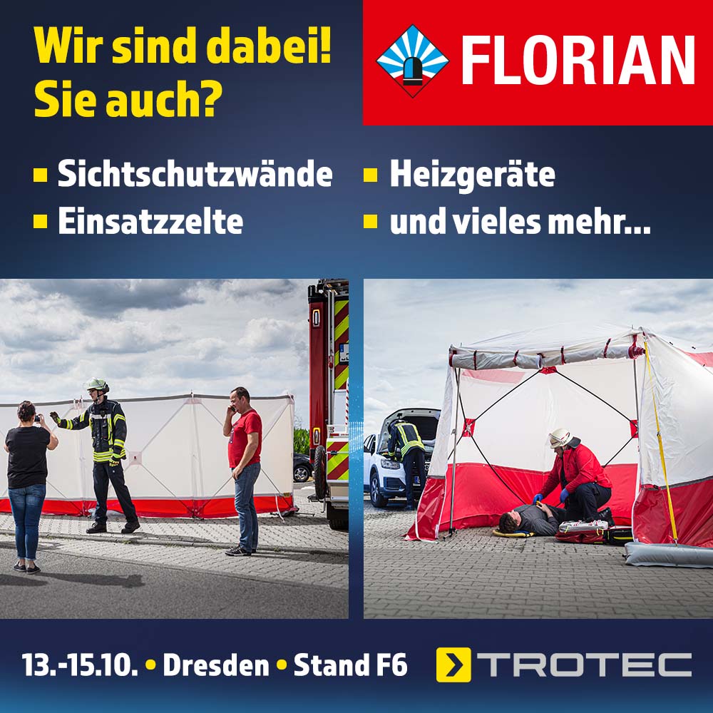 Vom 13. bis 15. Oktober 2022 findet mit der FLORIAN wieder die große Fachmesse für Feuerwehr, Zivil- und Katastrophenschutz statt. Als namhafter Lösungsanbieter für Profi-Equipment stellt Trotec seine aktuellen Produkt-Highlights auf dem Messestand live vor.