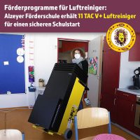 Gudrun Siegel-Bruns, Schulleiterin der Alzeyer Löwenschule, fährt den ersten TAC V+ Hochleistungsluftreiniger persönlich in den Klassenraum.