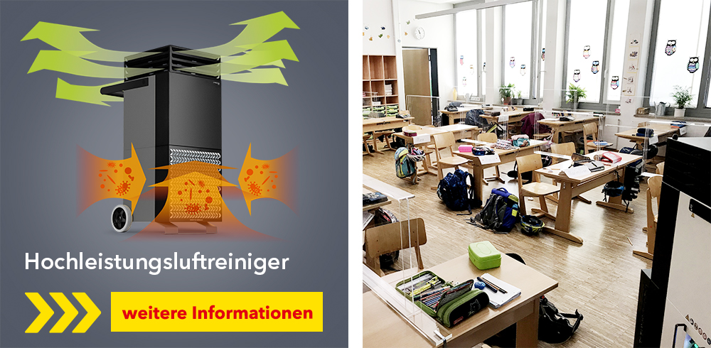 Acrylglas-Trennwände mit Aerosol-Schutzkante und Hochleistungsluftreiniger verhindern Viren- und Tröpfchenflug in Klassenräumen