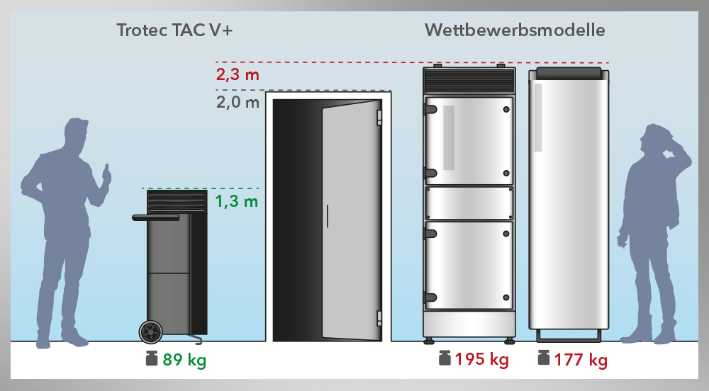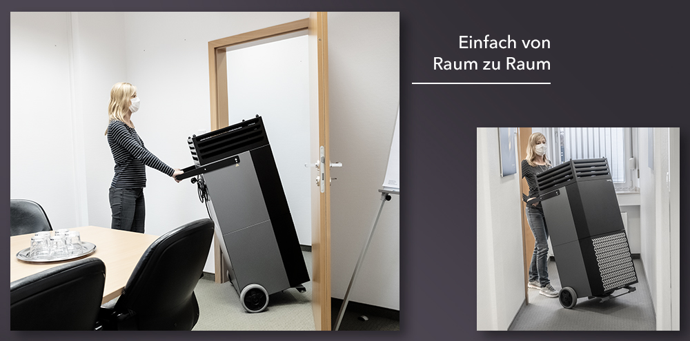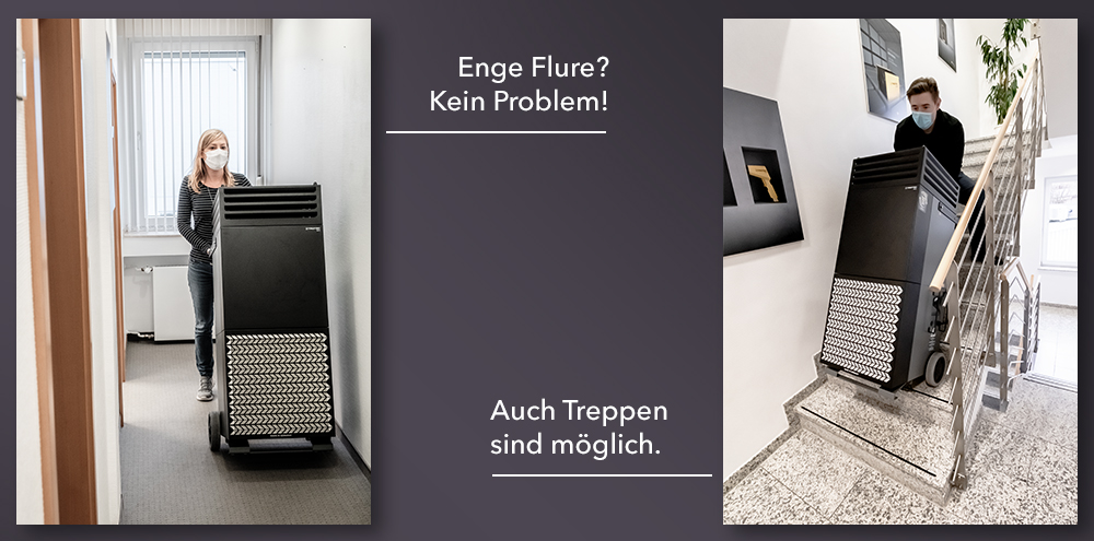 Für einen flexiblen Einsatz an verschiedenen Standorten verfügen die Hochleistungsluftreiniger der TAC-Serie über Leichtlaufrollen und einen Schubgriff. So lassen sich die Geräte ohne Aufwand zwischen den Klassenräumen hin- und herfahren, von nur einer Person! Zudem passt ein TAC ECO aufgrund seiner vergleichsweise geringen Höhe durch jede Tür und in jeden Aufzug. Ein unbezahlbarer Luxus in der Corona-Pandemie, von der aktuell noch niemand weiß, was uns die Zukunft bringt.