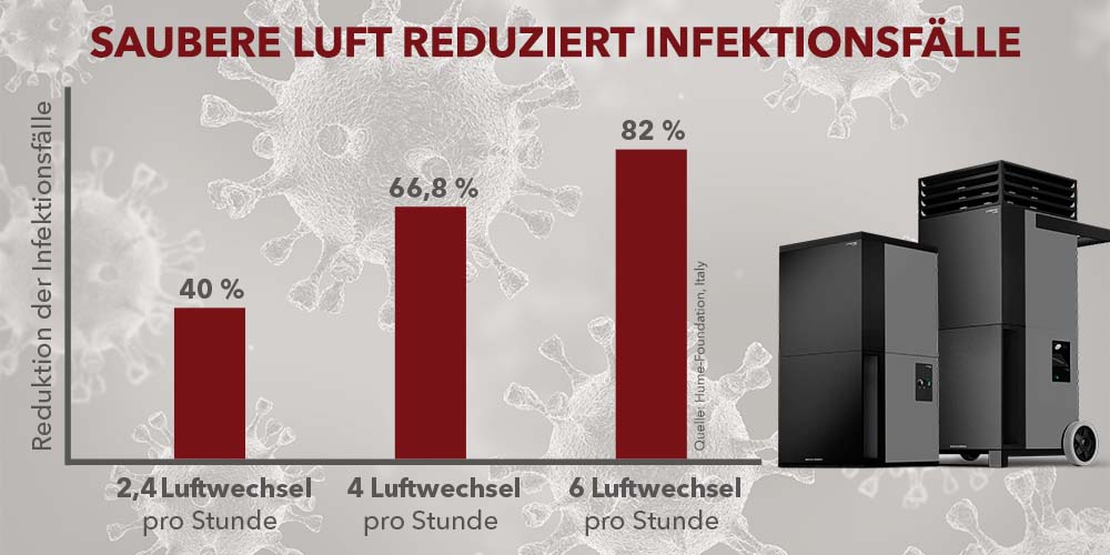 Durch den Einsatz von Geräten, die einen bis zu 2,4-fachen Luftaustausch der Raumluft je Stunde garantierten, wurden die Infektionsfälle um 40 Prozent reduziert. Bei einem 4-fachen Luftwechsel pro Stunde sanken die Ansteckungen im Vergleich um 66,8 Prozent, bei sechs Luftwechseln pro Stunde sogar um 82 Prozent.