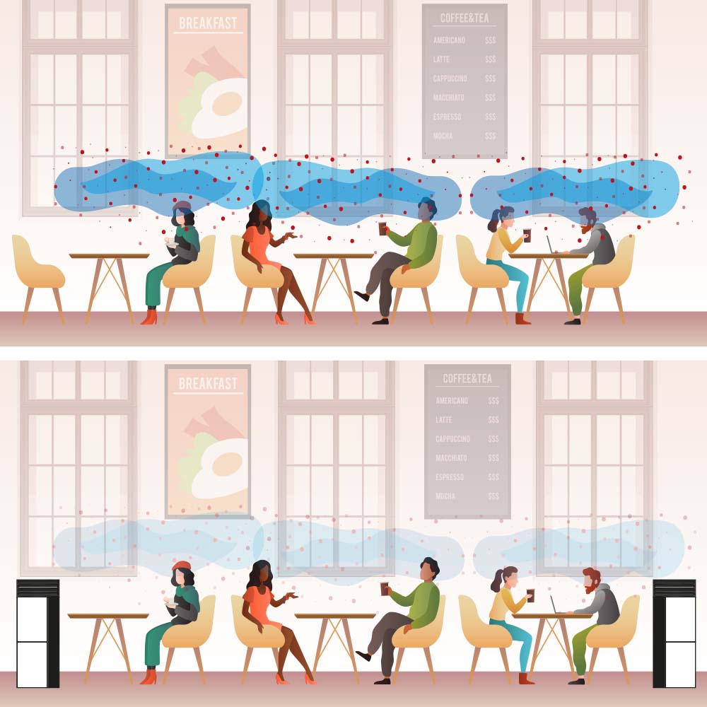 Entscheidend für die Ansteckungsgefahr in Innenräumen ist die Dauer, wie lange infektiöse Aerosolpartikel in der Raumluft verbleiben. Ein Aerosol ist ein gasförmiges Gemisch, das in der Lunge erzeugt wird und bei erkrankten Menschen Viren enthält. Die winzig kleinen Aerosolpartikel werden vorwiegend beim Atmen und Sprechen in den Raum freigesetzt. Während größere Tröpfchen aufgrund ihres Gewichts bereits nach ca. 1,5 Metern zu Boden sinken (daher die Abstandsregel von 1,5 m), schweben die leichten und unsichtbaren Aerosolteilchen aufgrund ihrer geringen Größe (ca. 0,1-0,3 µm) bis zu mehrere Stunden in der Raumluft, verteilen sich mitunter über Lüftungsanlagen und werden selbst viele Meter entfernt unbemerkt eingeatmet. Im Gegensatz zur Luft im Freien, wo Aerosolgemische durch die Luftbewegung mit sauberer Frischluft verdünnt und verweht werden, bleibt die Aerosolkonzentration in geschlossenen Räumen fortwährend hoch und steigt mit jedem Ausatmen an. Je länger und je mehr Aerosolteilchen in der Luft umherschweben, desto schneller gelangen diese über die Atemwege in den Körper und führen zu einer Infektion der Lunge.