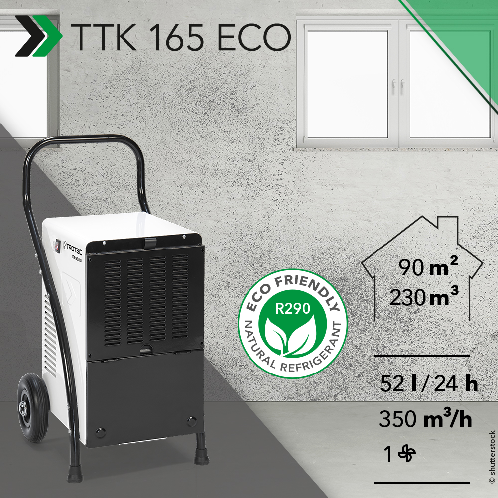 Der Gewerbe-Luftentfeuchter TTK 165 ECO ist sofort einsatzbereit, denkbar einfach zu bedienen und besticht mit einer Entfeuchtungsleistung von bis zu 52 Litern in 24 Stunden. Damit lassen sich Roh- und Neubauten sowie feuchte Räume bis 90 m² bzw. 230 m³ bei einer ausgestoßenen Luftmenge von 350 m³/h in Windeseile trockenlegen. Darüber hinaus eignet sich das kompakte Profi-Gerät dank seiner robusten Ausführung ideal für gewerbliche Dauereinsätze auch auf rauen Baustellen-Umgebungen. Das Beste: der budget- und praxisoptimierte Trockner überzeugt neben einer Vielzahl praktischer Ausstattungsmerkmale auch durch den Einsatz von umweltfreundlichem Kühlgas.