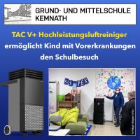 An der Grund- und Mittelschule Kemnath lassen sich die Fenster der Klassenräume öffnen. Auch wird während des Präsenzunterrichts regelmäßig gelüftet, weil verbrauchte Luft müde macht und die Konzentration beeinträchtigt. Um die Viren in der Raumluft kümmert sich jedoch ein TAC V+ Hochleistungsluftreiniger.