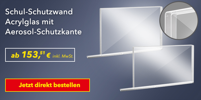 1. Trennwände mit Aerosol-Schutzkante machen das Tragen von Masken überflüssig. Transparente Schutzwände zwischen den Sitzplätzen verhindern, dass sich die Schüler durch umherfliegende Tröpfchen oder bei der Atmung freigesetzte Aerosole des direkten Tischnachbarn mit dem Covid-19-Erreger infizieren. Die glasklaren Trennwände mit Aerosol-Schutzkante bieten einen zuverlässigen Schutz vor größeren Tröpfchen und verhindern zudem, dass die von den Schülern ausgeatmeten Aerosole die Trennwand überwinden und zum Sitznachbarn schweben. Das Tragen einer Maske ist nicht mehr erforderlich. Lediglich beim Verlassen des Platzes muss eine Maske getragen werden.