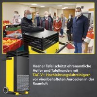 Auch die Haaner Tafel musste ihre Lebensmittelausgabe zum Beginn der Corona-Pandemie für einen längeren Zeitraum einstellen, um die Mitarbeiter vor den Gefahren einer Ansteckung zu schützen. Damit die regelmäßige Versorgung der Tafelkunden dennoch aufrechterhalten werden konnte, wurde zeitweise ein Bringdienst organisiert. Nun aber kann die Haaner Tafel ihren wichtigen Dienst für die Tafelkunden wieder wie gewohnt und auch im Winter infektionssicher fortführen. Möglich wird dies durch den Einsatz von zwei TAC V+ Hochleistungsluftreinigern der Firma Trotec in den Räumen der Haaner Tafel. Alleine hätte die ehrenamtlich organisierte Tafel die Anschaffung der Geräte indes nicht stemmen können.