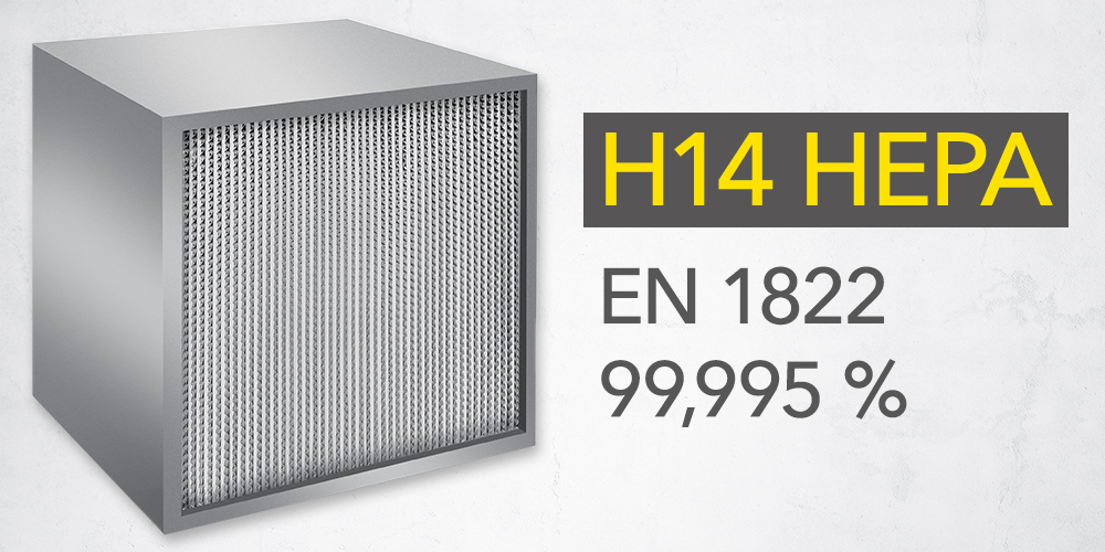 H14-HEPA-Hochleistungsfilter (zertifiziert nach EN 1822) , wie sie auch in den Luftreinigern TAC V+ , TAC M und TAC ECO zum Einsatz kommen, können selbst kleine, virenbehaftete Aerosole (0,1-0,3 µm) aus der Raumluft filtern, und zwar zu 99,995 %. Damit haben H14-HEPA-Filter bereits eine 10-fach höhere Filterleistung als H13-HEPA-Filter, deren Filterleistung im Größenbereich von Bakterien zwar noch vergleichbar gut ist. Signifikante Unterschiede gibt es jedoch im sogenannten MPPS-Bereich (Most Penetrating Particle Size), also bei der Ausfilterung von Viren und Aerosolen. Hier rät die Projektgruppe Labortechnik (ELATEC) der Bundesanstalt für Arbeitsschutz und Arbeitsmedizin in ihrer Stellungnahme zum Thema „Einsatz von HEPA-Filtern in Raumlufttechnischen Anlagen (Beschluss 16/2010)“ ausdrücklich: „Die HEPA-Filter sollten mindestens der Klasse H14 nach DIN EN 1822-1 entsprechen.“