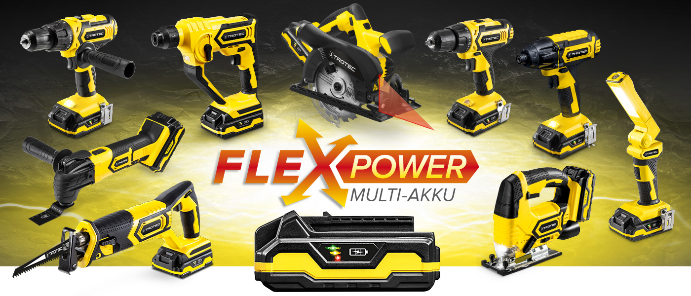 Nur wo Flexpower draufsteht, ist auch echte Power drin. Bei Trotec-Elektrogeräten mit Flexpower-Akkus profitieren Sie während der Arbeit nicht nur von maximalem Bewegungsfreiraum ohne störende Kabel – Sie können die Flexpower-Akkus darüber hinaus auch flexibel mit anderen Akku-Geräten aus unserem Programm kombinieren.