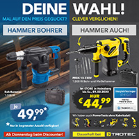 Verlockende Angebote gibt es viele, aber Moment, haben Sie die aktuelle Werbung wirklich genau verglichen? Beim Discounter um die Ecke gibt es ab Donnerstag (in begrenzter Anzahl) einen Bohrhammer zu einem interessanten Preis, das Angebot können wir bis Samstag, 01.02.2020 im Trotec STORE in Heinsberg toppen!