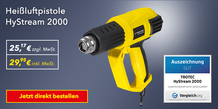 Mit 29,99 € deutlich günstiger und kompromisslos konkurrenzfähig ist die bei Hand- und Heimwerkern beliebte Heißluftpistole HyStream 2000 von Trotec.
