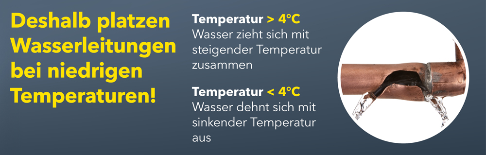 In ungedämmten Wintergärten, Kellerräumen, Garagen aber ebenso in Räumen mit schlechter Wärmeisolierung kann die Raumtemperatur bei eisigen Außentemperaturen und ausgeschalteter Heizung schlagartig abfallen. In der Folge sinkt auch die Wassertemperatur in Kaltwasserleitungen. Das Problem dabei: Das Volumen von Wasser nimmt unterhalb von 4°C zu. Das Wasser dehnt sich aus und bringt Leitungsrohre zum Platzen.