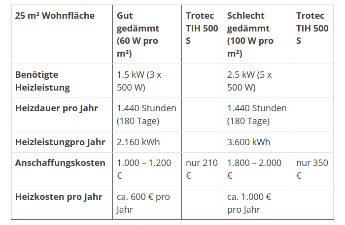 Anhand eines Beispiels verdeutlichen wir, wie die Anlagengröße einer Infrarotheizung berechnet wird. Nehmen wir an, es soll ein Raum mit 25 m² Fläche beheizt werden. Üblicherweise wird pro Quadratmeter Raum etwa 60 bis 100 Watt Heizleistung benötigt – das heißt, zur Raumtemperierung sind etwa 2.500 Watt Heizleistung erforderlich. Um die Wärme sinnvoll zu verteilen, sollten dafür 5 kleinere Anlagen mit je 500 Watt Leistung installiert werden. Dafür würden sich die Anschaffungskosten im Durchschnitt insgesamt auf 1.000 bis 2.000 Euro belaufen – oder Sie greifen zu den Angeboten beim Markt- und Preisführer Trotec: Bei uns kosten 5 Geräte aus der TIH-Serie zu je 500 Watt insgesamt nur rund 350 Euro.