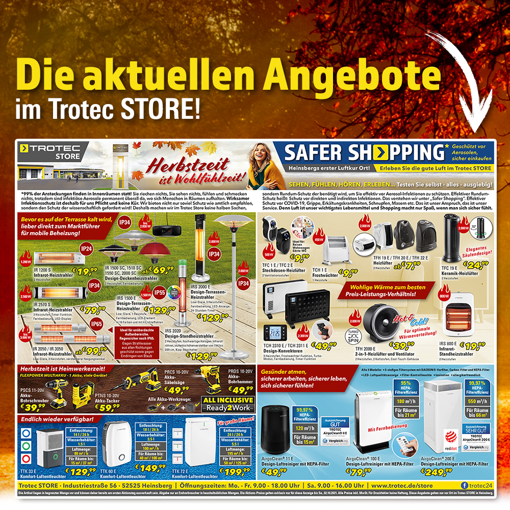 *Die Artikel liegen in begrenzter Menge vor und können daher bereits am ersten Aktionstag ausverkauft sein. Abgabe nur an Endverbraucher in haushaltsüblichen Mengen. Die Aktions-Preise gelten exklusiv nur für diesen Newsletter bis Fr., 01.10. und sind nur bei Trotec vor Ort in Heinsberg gültig.