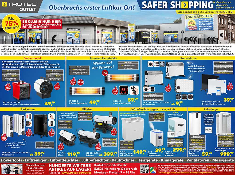 Wir bieten nicht nur soviel Schutz wie amtlich empfohlen, sondern den Schutz der wissenschaftlich gefordert wird! Deshalb machen wir im Trotec Store und Outlet keine halben Sachen, sondern Rundum-Schutz der benötigt wird, um Sie effektiv vor Aerosol-Infektionen zu schützen. Effektiver Rundum-Schutz heißt: Schutz vor direkten und indirekten Infektionen. Das verstehen wir unter ‚,Safer Shopping‘‘. Effektiver Schutz vor COVID-19, Grippe, Erkältungskrankheiten, Schnupfen, Masern etc. Das ist unser Anspruch, das ist unser Service. Denn Luft ist unser wichtigstes Lebensmittel und Shopping macht nur Spaß, wenn man sich sicher fühlt.