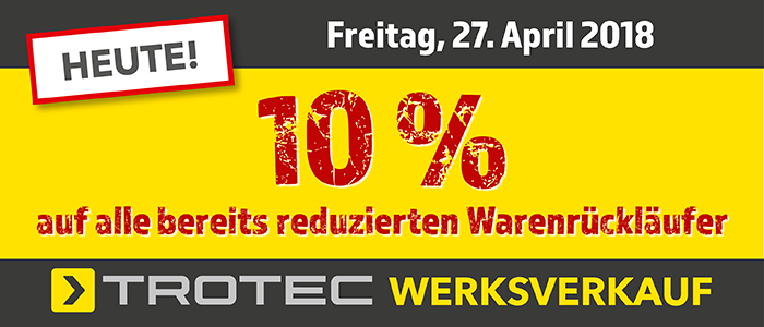 Auf alle bereits reduzierten Warenrückläufer und Gebrauchtgeräte gibt es 10% Rabatt. Alles in original Trotec Markenqualität! Direkt vom Hersteller und inklusive bester Beratung — was will man mehr?