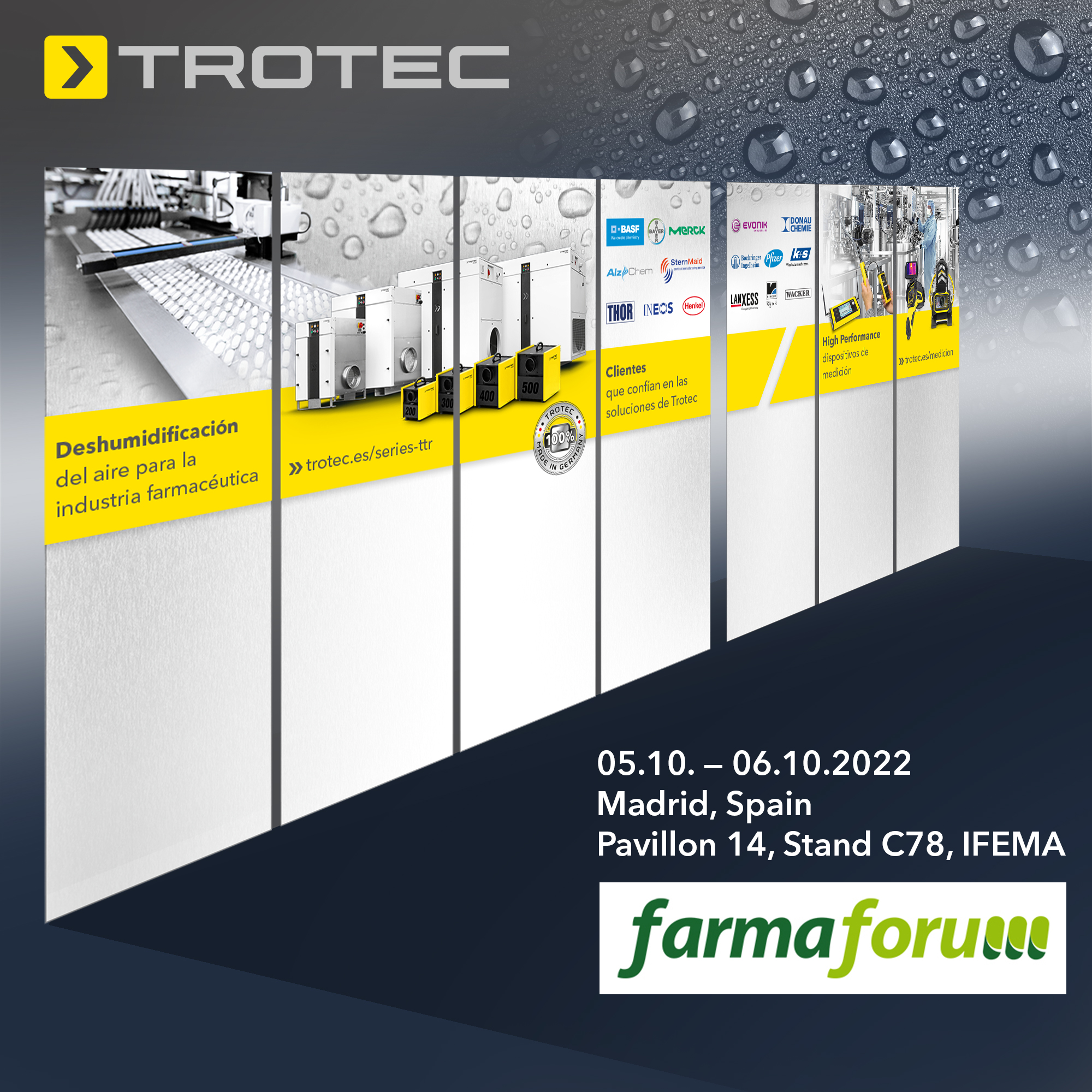 Heute eröffnet Trotec seinen Messestand auf dem Farmaforum 2022 in Madrid. Vorgestellt werden Neuheiten und Trotec-Innovationen für die pharmazeutische Industrie. Treffen Sie unsere Experten am Stand C78 (Halle 14) und lassen Sie uns gemeinsam Antworten und Lösungen für aktuelle und zukünftige Herausforderungen finden.