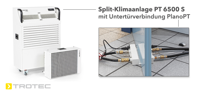 Warme Luft muss über die Schlauchleitung einer Split-Klimaanlage nach draußen abtransportiert werden, ohne dass sie durch die geöffneten Fenster oder Türen sofort wieder hereinströmt. Trotec hat hierzu eine revolutionäre Lösung gefunden: die Untertürverbindung PlanoPT, das ideale Zubehör für jedes wassergekühlte PT-Klimaaggregat. Dank ihrer ultrakompakten Bauart mit nur 5 mm Mittelteilhöhe ist die PlanoPT perfekt für flexible Untertür-Durchleitungen geeignet. Das Strömungsdesign des wasserdichten Mehrkammersystems wurde speziell für die Durchflussraten der PT-Klimaaggregate optimiert und garantiert die störungsfreie Durchleitung ohne Gegendruck.