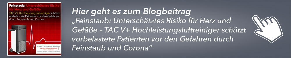 Ihre eigene Praxis hat die Ärztin bereits frühzeitig mit TAC V+ Hochleistungsluftreinigern ausgestattet. Im ambulanten Herz-Kreislauf-Zentrum steht die Erkennung und Behandlung von Erkrankungen des Herzes sowie damit verbundener Krankheitsbilder im Mittelpunkt der täglichen Arbeit. Wer als Patient in die Sprechstunde kommt, zählt mit ziemlich hoher Wahrscheinlichkeit zur sogenannten Risikogruppe, bei denen im Falle einer Covid-19-Erkrankung mit einem schwereren Krankheitsverlauf zu rechnen ist.