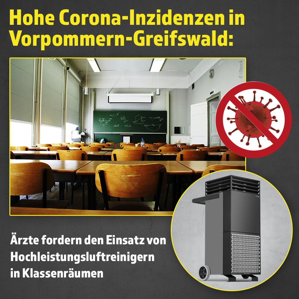 Die Vorsitzende der Initiative Ärztliche Fortbildung und Kommunikation Nord/Ost, Christine Bahr, fordert zur Bekämpfung des Coronavirus Luftreiniger für mehr Schulen. Bislang können in den meisten Bundesländern nur die Schulen Fördermittel zur Anschaffung geeigneter Luftreiniger beantragen, in denen sich die Klassenräume nicht mit geöffneten Fenstern ausreichend lüften lassen. Aus diesem Grund hatte der Kreistag von Vorpommern-Greifswald – der aktuell wegen besonders hoher Corona-Inzidenzen unfreiwillig im Fokus steht – erst kürzlich einen Antrag über 200.000 Euro für die Anschaffung mobiler Luftreiniger für Schulen abgelehnt.