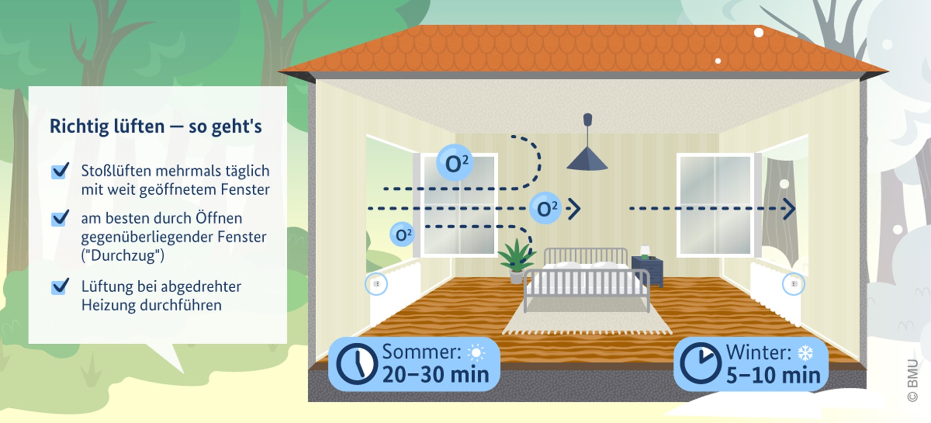 - Stoßlüftung mehrmals täglich mit weit geöffnetem Fenster, am besten durch Öffnen gegenüberliegender Fenster („Durchzug“)