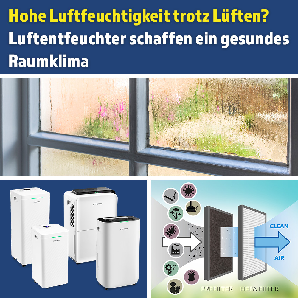 Führt regelmäßiges Lüften nicht zum gewünschten Ziel oder wird im Winter zur Heizkosteneinsparung weniger gelüftet, empfehlen Fachleute mobile Luftentfeuchter, um die Raumluftfeuchte zu senken.