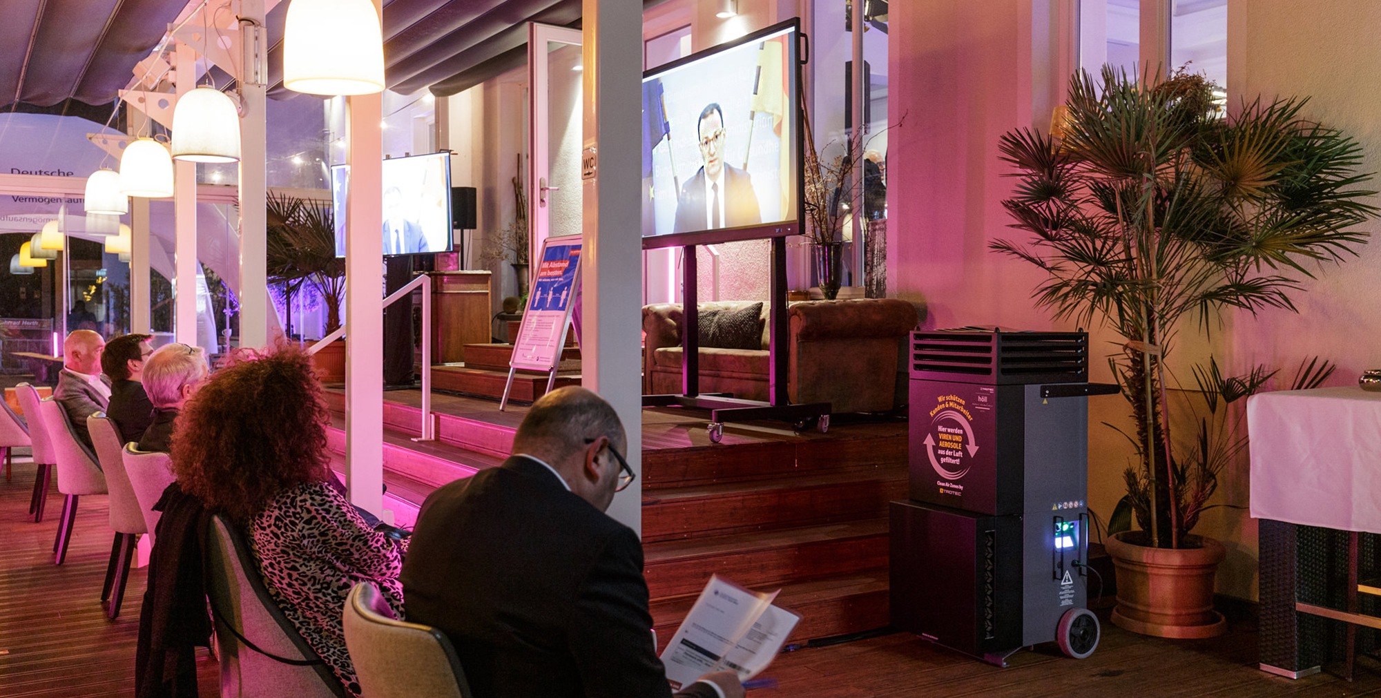 Entscheidend für die Ansteckungsgefahr mit dem Coronavirus ist die Dauer, wie lange virenbehaftete Aerosole in der Raumluft verbleiben. Denn im Gegensatz zur Luft im Freien, wo Aerosolegemische durch die Luftbewegung mit sauberer Frischluft verdünnt und verweht werden, bleibt die Aerosolkonzentration in unzureichend belüfteten Innenräumen fortwährend hoch. Eine dauerhafte Querlüftung mit offenen Fenstern und Türen wäre aufgrund der kühlen Herbsttemperaturen jedoch nicht möglich gewesen. Das hätte nicht nur das Wohlbefinden der Talk-Gäste empfindlich beeinträchtigt, sondern auch das der übrigen Hotelgäste. Daher hat sich Roland Höll für Trotec-Hochleistungsluftreiniger als wirksame Alternative zur Lüftung entschieden, da dieser laut Untersuchungen von Prof. Dr. Christian Kähler an der Universität der Bundeswehr München einen sogar noch höheren Schutz vor virenbehafteten Aerosolen in der Raumluft bieten.