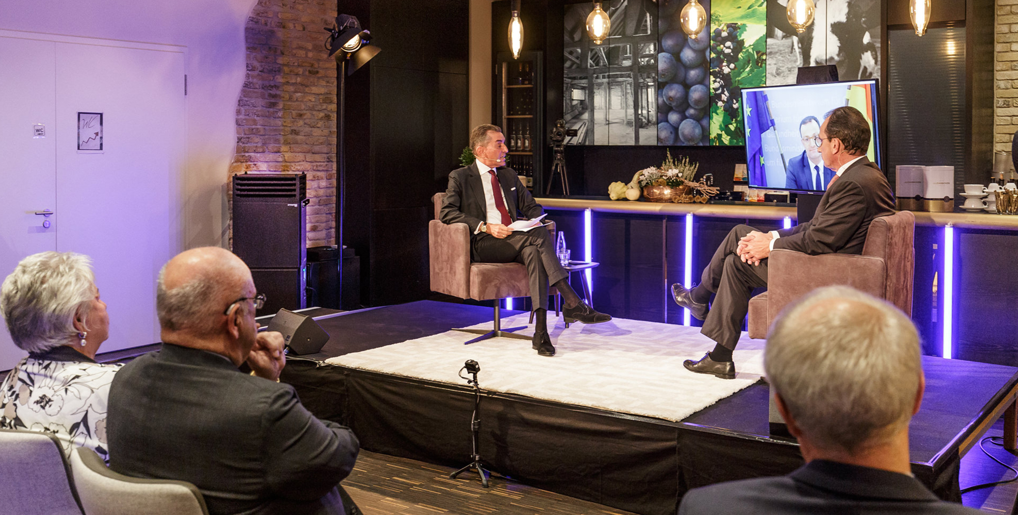 Moderator Michel Friedmann, der hessische Finanzminister Michael Boddenberg und der per Video zugeschaltete Gesundheitsminster Jens Spahn diskutierten auf der Bühne. Links im Bild sorgte der Hochleistungsluftreiniger TAC V+ während des gesamten Abends für virenfreie Raumluft.