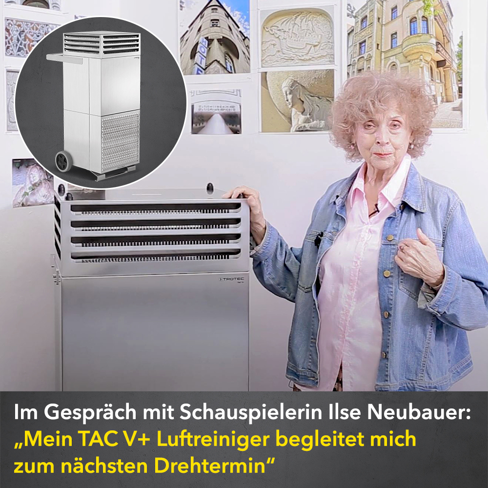 Bereits beschlossene Sache sei, so die Schauspielerin, dass sie sich auch noch einmal mit ihren Freunden trifft, im Münchner Atelier ihres Sohnes und Fotografen Andreas Neubauer, wo der TAC V+ aktuell für virengefilterte Raumluft sorgt. „Wir sind alle im Hochrisikoalter. Dann fühlen wir uns sicher und können uns endlich mal wiedersehen“. Natürlich mit Maske und Abstand. Denn auch wenn der Raumluftreiniger das indirekte Ansteckungsrisiko durch potentiell infektiöse Aerosole in der Raumluft reduziert, vor größeren Tröpfchen schützt das Gerät nicht. Daher sollte auch beim Einsatz von hochwirksamen Raumluftreinigern wie dem TAC V+ nicht auf das Tragen von Mund-Nasen-Masken verzichtet werden, so Professor Dr. Christian Kähler. Nur ein kombinierter Schutz vor der direkten und indirekten Ansteckung könne dazu beitragen das Corona-Infektionsgeschehen einzudämmen.