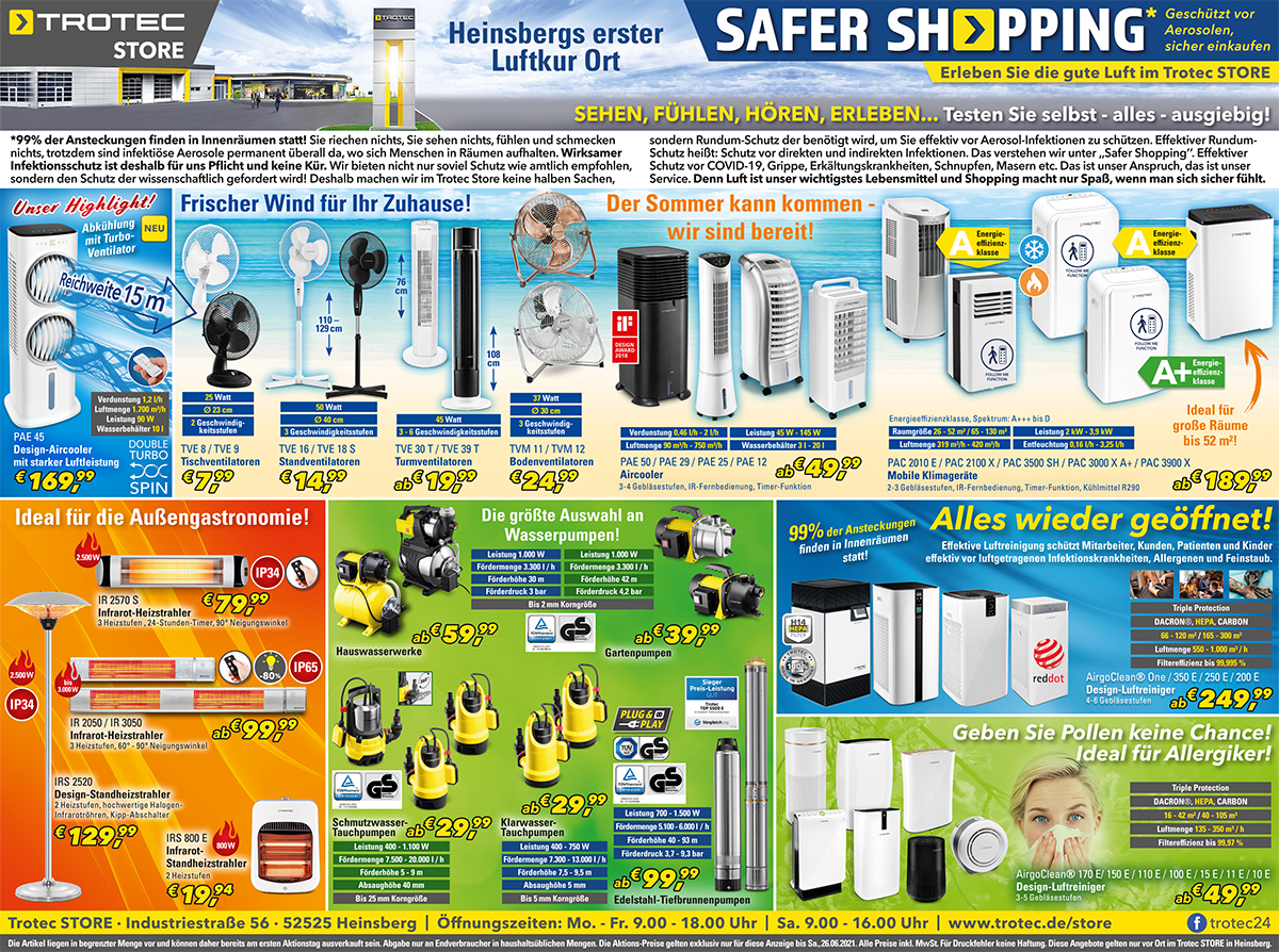 *Die Artikel liegen in begrenzter Menge vor und können daher bereits am ersten Aktionstag ausverkauft sein. Abgabe nur an Endverbraucher in haushaltsüblichen Mengen. Die Aktions-Preise gelten exklusiv nur für diesen Newsletter bis Sa., 26.06. und sind nur bei Trotec vor Ort in Heinsberg gültig.