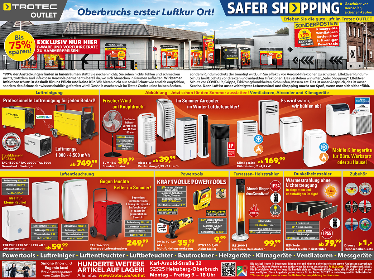 In unserem OUTLET bieten wir z. B. Ventilatoren, Klimageräte, Aircooler, Luftentfeuchter, Terrassen-Heizstrahler, Luftreiniger, Elektrowerkzeuge und vieles mehr schon ab 5,- € an! Natürlich wurden alle Versandretouren-Artikel und Vorführgeräte vorab von uns auf Herz und Nieren geprüft. So bekommen Sie einwandfreie Funktion zu stark vergünstigten Sonderpreisen.