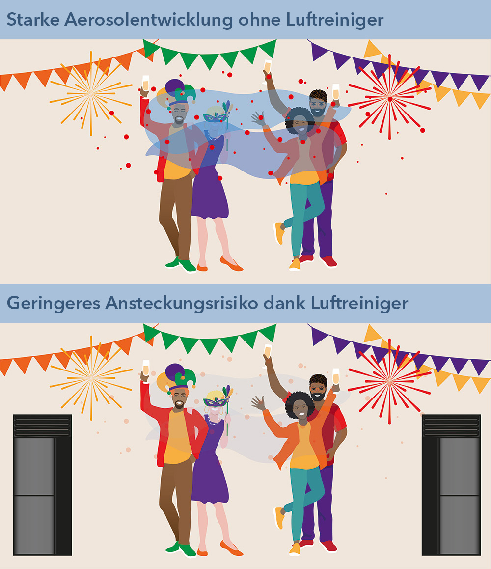 Mittlerweile gilt es als gesichert, dass sich das Corona-Virus über die Innenraumluft der Karnevalssitzung unter den Feiernden ausgebreitet hat: „Mehr als 90 Prozent aller Corona-Infektionen finden in Innenräumen statt“, sagt Deutschlands bekanntester Aerosolforscher Dr. Gerhard Scheuch. Ob beim gemeinsamen Schunkeln auf der Kappensitzung oder in der Kneipe – die Gefahr, infektiöse Viren über die Raumluft einzuatmen, feiert unsichtbar mit: „Wir wissen, dass sich 99,9 Prozent aller Infektionen drinnen ereignen.“, sagt Scheuch und ergänzt: „Das heißt, wir müssen uns auf die Innenräume konzentrieren“, um Infektionen mit luftübertragbaren Viren in Innenräumen zu verhindern. Wird die Innenraumluft permanent mit Hochleistungsluftreinigern von Krankheitserregern befreit, lässt sich die Übertragbarkeit krankmachender Viren erheblich reduzieren.