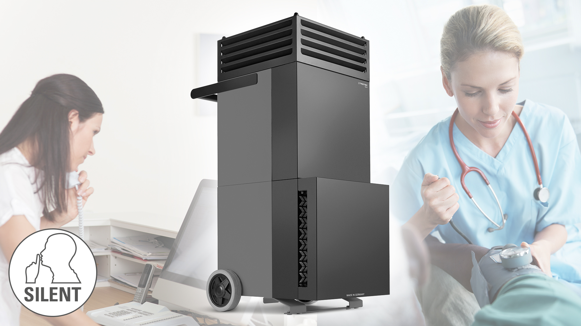 Im Wartebereich der von Dr. Jan Brünsing und Dr. Dhaksanan Thiruchittampalam geführten Privatpraxis summt leise ein TAC V+ Hochleistungsluftreiniger. Unaufdringlich und in einer Lautstärke, dass man das Geräusch bereits nach wenigen Sekunden nicht mehr wahrnimmt – selbst wenn man direkt neben dem zentral aufgestellten Gerät Platz nimmt. Der konkurrenzlos leise Betrieb des TAC V+, bei gleichzeitig hoher Luft- und Filterleistung, war für Jan Brünsing ein entscheidendes Kaufkriterium: „Der Empfangsbereich ist die Visitenkarte einer Arztpraxis“. In der Praxis für „Innere Medizin im Mediapark“ grenzt die Wartezone für die Patienten unmittelbar an das Entrée der Praxis an. Um bei der Erhebung der Patientendaten die notwendige Diskretion zu wahren, sind die Arzthelferinnen angewiesen, möglichst leise mit den Patienten zu sprechen. Störgeräusche eines lärmenden Gerätes galt es daher unbedingt zu vermeiden. „Ein optimiertes Schalldämmkonzept mit Schallschutzhaube stellt beim TAC V+ sicher, dass der mobil einsetzbare Luftreiniger in geräuschsensiblen Umgebungen nahezu nicht wahrnehmbar seinen Dienst verrichtet.“