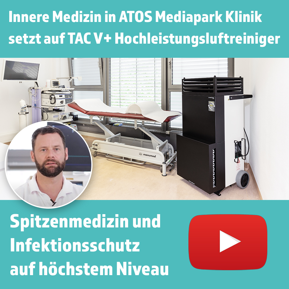 Wenn mobile TAC V+ Luftreiniger zum Schutz vor dem Coronavirus in einer internistischen Praxis mit Rundum-Betreuung in den Bereichen Innere Medizin, Kardiologie, Hepatologie, hausärztliche Betreuung und Vorsorge zum Einsatz kommen, müssen sie hohen Anforderungen genügen. Umso mehr, wenn sich die Praxis in der ATOS Mediapark Klinik in Köln befindet, wo ausgewiesene Spezialisten Spitzenmedizin auf höchstem Niveau praktizieren.