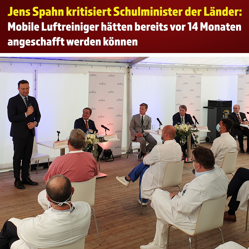 Bundesgesundheitsminister Jens Spahn hat sich in der aktuellen Debatte um fehlende Luftreiniger in Schulen zu Wort gemeldet und sich klar zugunsten der technischen Raumluftreinigung als wirksamen Schutz vor einer Corona-Infektion ausgesprochen. In einem Interview mit dem SPIEGEL kritisierte Spahn die Schulpolitik der Kultusminister scharf. Er verstehe den Unmut der Eltern, Lehrer und Schüler, dass in vielen Klassenräumen nach wie vor keine mobilen Luftreiniger für einen möglichst sicheren Präsenzunterricht sorgen. „Aber der sollte sich bitte an die Schulministerinnen und -minister der Länder richten. Die hätten schon vergangenen Sommer Luftfilter besorgen können. Mich ärgert das maßlos, weil wir seit 14 Monaten darüber diskutieren. Jede Behörde schiebt das einer anderen zu“, so Spahn im Interview.