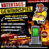 Der Vatertag steht vor der Tür und für unsere Super Dads haben wir uns etwas ganz Besonderes überlegt. Gewinnen Sie jeweils ein Grillthermometer BT40 – die kabellose Temperaturkontrolle beim Grillen, Braten und Backen. Mithilfe des BT40 von Trotec kontrollieren Sie im Handumdrehen die Temperatur Ihres Grillguts. Mit einer Stoppuhr- und Timer-Funktion, einer Funkreichweite von bis zu 20 m und einem Gar-Assistenten für 8 vorwählbare Fleischsorten bzw. Lebensmittel gelingt jede Zubereitung auf den Garpunkt genau!