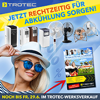 Puh.. die nächste Hitzewelle geht los. Wenn die Wärme erst einmal voll da ist, stehen Sie bei vielen Geschäften vor leeren Regalen oder müssen nehmen was übrig ist. Nicht so bei Trotec: Als Wohlfühlklimaspezialist gibt es in unserem Werksverkauf in Heinsberg-Oberbruch immer eine große Auswahl an mobilen Klimageräten, Ventilatoren und Luftkühlern. Und noch besser: Bis Freitag, 29.6. gelten noch unsere besonders günstigen Prospekt-Angebote. Also kommen Sie am besten direkt vorbei und sichern sich echte Erfrischungs-Schnäppchen!