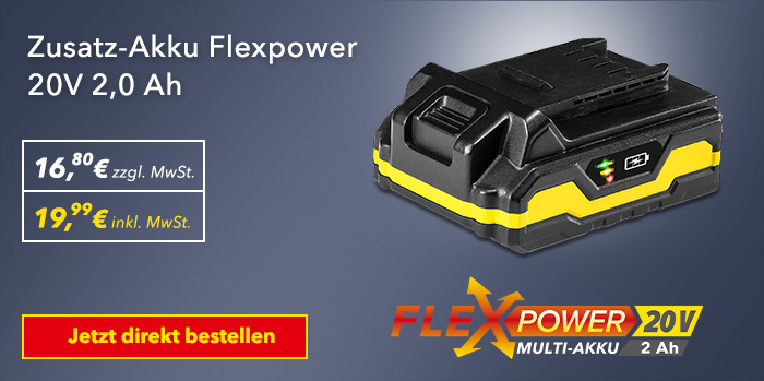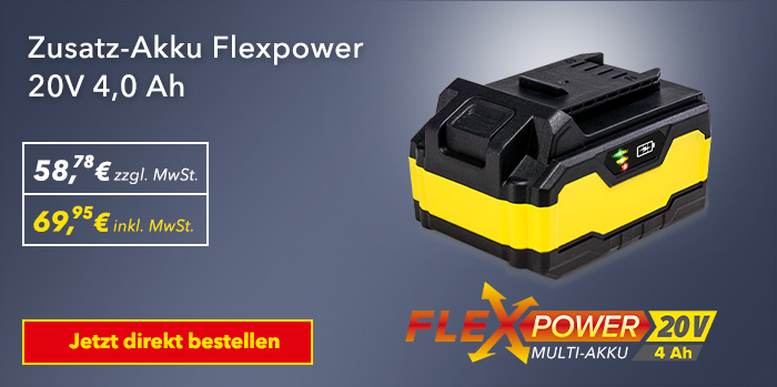 Tipp: Mit dem Zusatzakku Flexpower 20V 4,0 Ah arbeiten Sie noch länger kabellos. 4 Ah Ladekapazität ermöglichen mehr als eineinhalbfach längere Gerätelaufzeiten im Vergleich zu Standard-Akkus mit 1,5 Ah und immerhin noch doppelt so lange Laufzeiten gegenüber unseren Flexpower-Akkus mit 2 Ah.