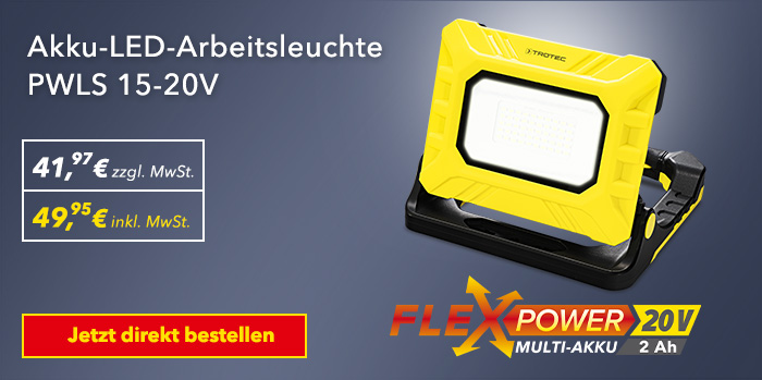 Reicht die vorhandene Lichtquelle in der Werkstatt bzw. im Lager nicht aus oder fehlt eine den Arbeitsbedingungen angepasste Beleuchtung komplett, ist die kabellose Akku-LED-Arbeitsleuchte PWLS 15-20V ideal. Ausgestattet mit einem leistungsstarken FlexPower Multi-Akku bringt der Arbeitsstrahler ausreichend Licht an jeden Arbeitsplatz und überzeugt dank modernster COB-LED-Technik mit einer besonders hohen Energieeffizienz.