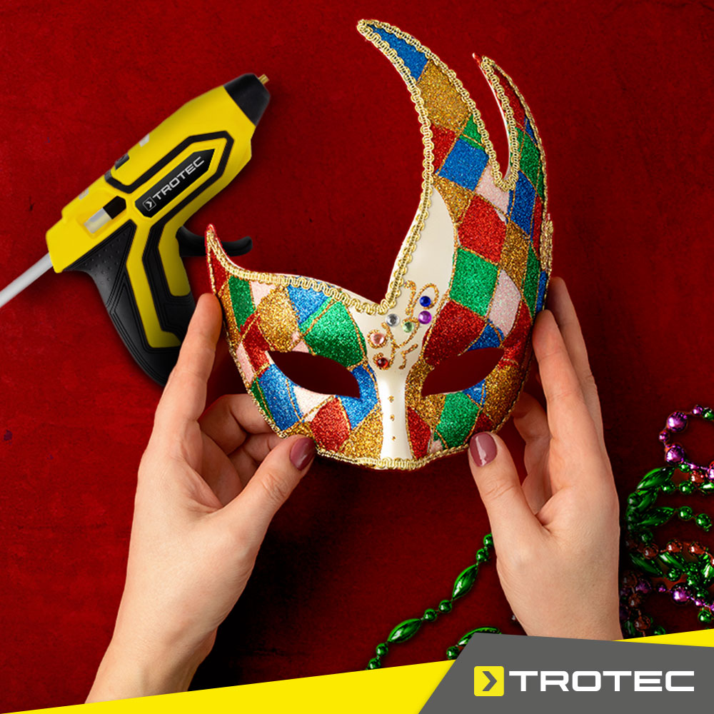 Herrlich verkleidet lässt sich Karneval am schönsten feiern. Möchten Sie nicht auch das Kostüm Ihrer Wahl mit zusätzlicher Deko zum absoluten Hingucker aufpeppen? Von Glitzersteinen, Federn, Pailletten und jede Menge Perlen auf Schultercape oder Krone bis hin zu einem dicken Popkorn-Knubbel auf der Kochmütze geht alles! Wie Sie das alles sicher und wasserfest befestigen? Na, natürlich mit einer Heißklebepistole aus der PGGS-Serie von Trotec – und den dazu passenden Heißklebestiften in transparent, in bunt und mit Glitzereffekt.