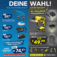 Verlockende Angebote gibt es viele, aber Moment, haben Sie wirklich genau verglichen oder sich nur vom Preis auf den ersten Blick blenden lassen? Beim Discounter um die Ecke gibt es diese Woche Elektrowerkzeuge zu einem interessanten Preis, das haben wir uns einmal näher angeschaut und mit unseren „Ready2Work“ Komplettsets verglichen.