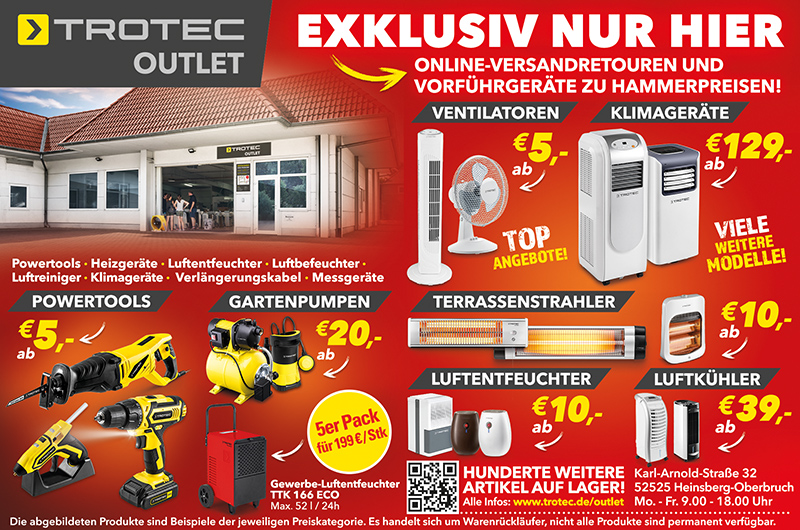 Besuchen Sie uns doch wieder einmal im Trotec STORE in Heinsberg und nutzen Sie die Gelegenheit unser umfangreiches Produktsortiment und ausführliche Fachberatung zum besten Preis-Leistungs-Verhältnis zu genießen! Es lohnt sich, versprochen…