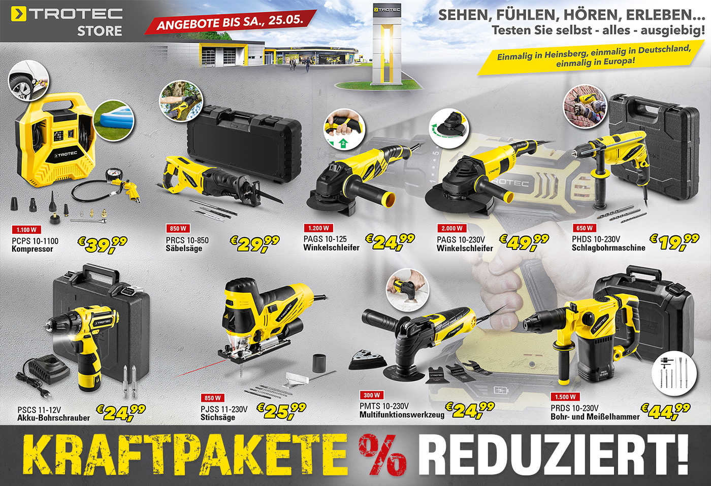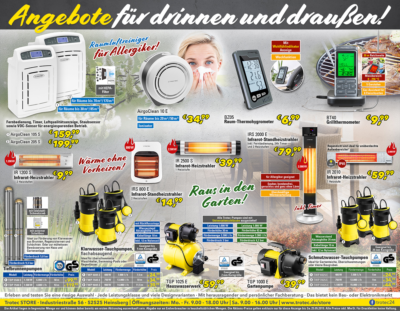 Die Angebotspreise für folgende Artikel sind bis Samstag, 25.05.2019 im Trotec STORE gültig. Aber auch in unserem Trotec OUTLET gibt es weiter unten wieder interessante Schnäppchen!