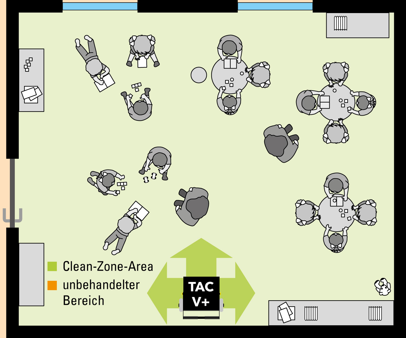 Beim Atmen, Sprechen oder Husten stoßen wir nicht nur große, sichtbare Tröpfchen in einer Art „Sprühregen“ in den Raum aus, sondern in viel größerem Ausmaß auch winzig kleine Aerosole. Während die großen Tröpfchen aufgrund ihres Gewichtes bereits nach rund 1,5 Metern zu Boden sinken (hieraus resultiert die Abstandsregel von 1,5 Metern), halten sich infektiöse und nur einen tausendstel Millimeter große Aerosole „tatsächlich für mehrere Stunden“ in der Luft. Daher schützen Abstandsregeln, kleinere und räumlich getrennte Gruppen sowie häufigeres Händewaschen alleine nicht vor einer Übertragung des Virus. Beim Sprechen freigesetzte Aerosole verbreiten sich über die zirkulierende Raumluft unsichtbar im Raum und werden eingeatmet. Ziel muss es daher sein, die Atemluftdurchmengung aller Spielgruppen so weit wie möglich zu verhindern. Und dies gelingt durch den kombinierten Einsatz eines TAC-V+-Luftreinigers.